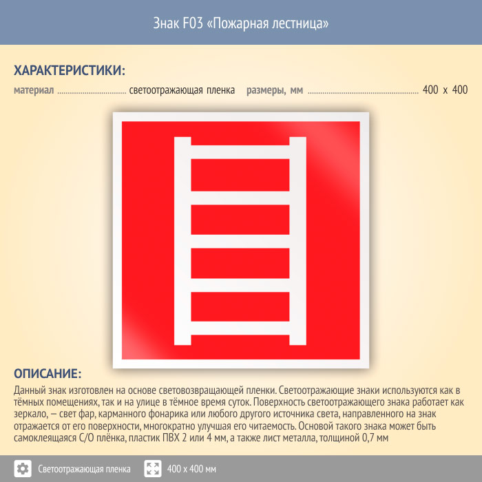 Знак F03 «Пожарная лестница» (светоотражающая пленка, 400х400 мм)