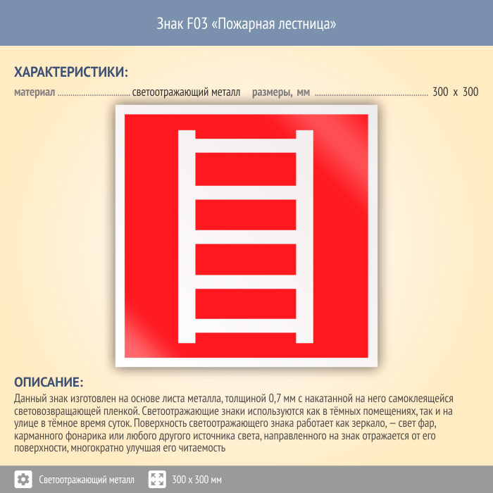 Знак F03 «Пожарная лестница» (светоотражающий металл, 300х300 мм)