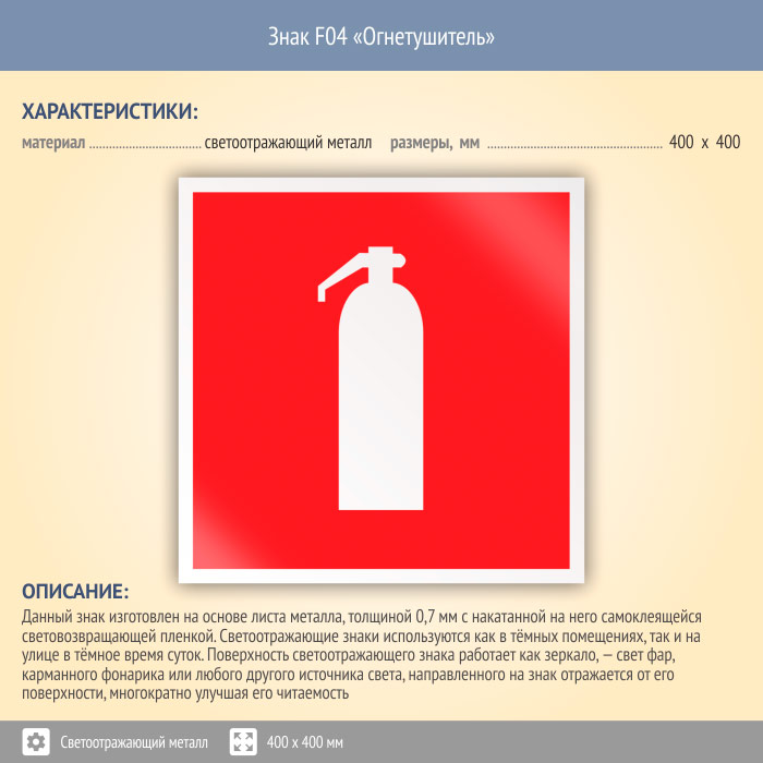 Знак F04 «Огнетушитель» (светоотражающий металл, 400х400 мм)