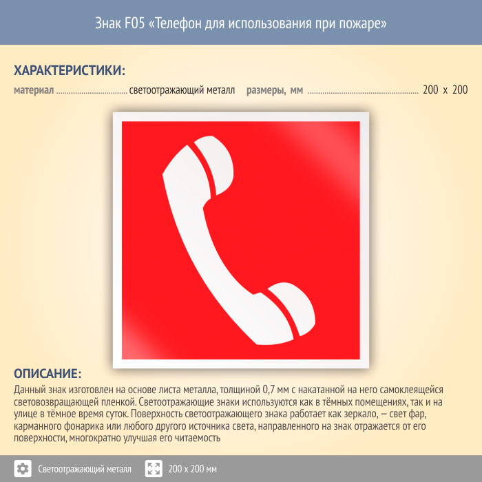 Знак F05 «Телефон для использования при пожаре (в том числе телефон прямой связи с пожарной охраной)» (светоотражающий металл, 200х200 мм)