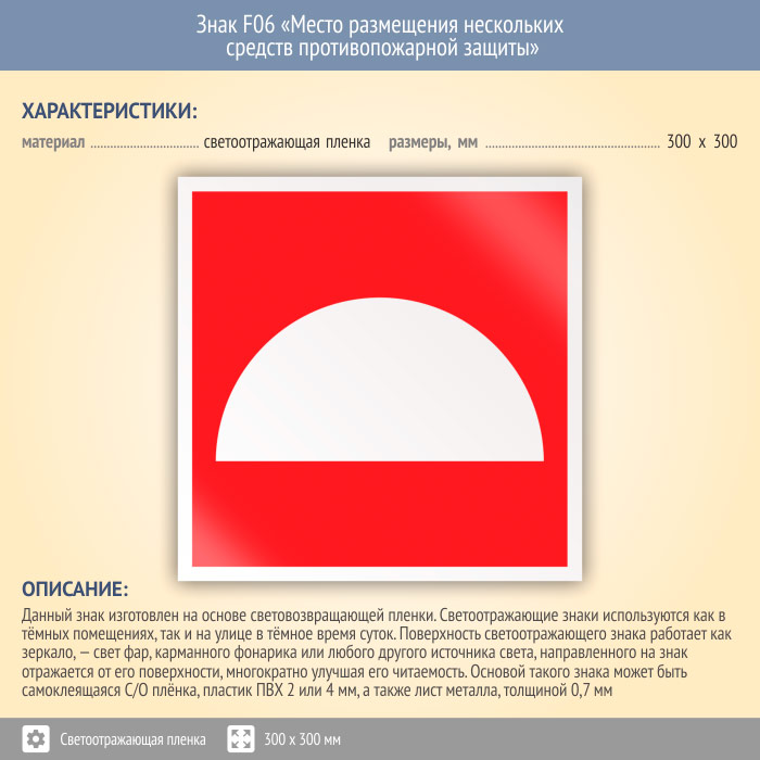 Знак F06 «Место размещения нескольких средств противопожарной защиты» на светоотражающей пленке, размером 300х300 мм указывает место хранения одного или более средств пожарной безопасности. Знаки пожарной безопасности изготовлены согласно ГОСТ Р 12.4.026-2015 и предназначены для обозначения мест нахождения средств противопожарной защиты и средств оповещения о возникновении пожара