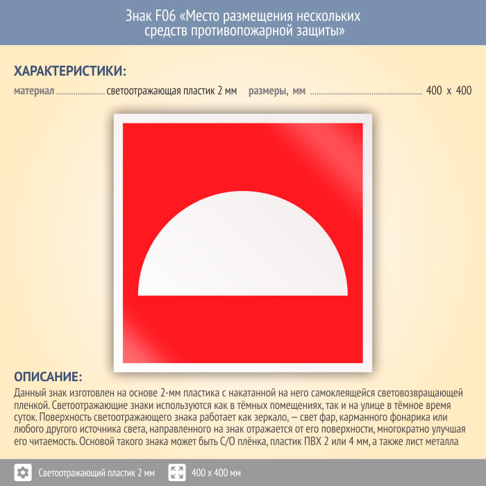 Знак F06 «Место размещения нескольких средств противопожарной защиты» на светоотражающем пластике, размером 400х400 мм указывает место хранения одного или более средств пожарной безопасности. Знаки пожарной безопасности изготовлены согласно ГОСТ Р 12.4.026-2015 и предназначены для обозначения мест нахождения средств противопожарной защиты и средств оповещения о возникновении пожара