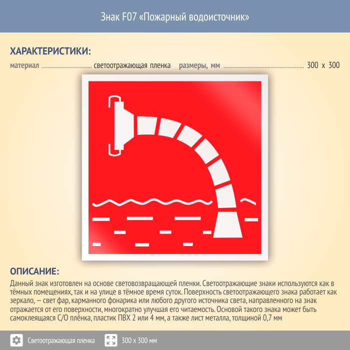 Знак F07 «Пожарный водоисточник» (светоотражающая пленка, 300х300 мм)