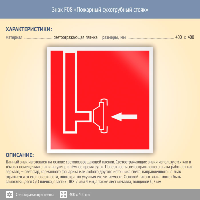 Знак F08 «Пожарный сухотрубный стояк» на светоотражающей пленке, размером 400х400 мм обозначает месторасположение пожарного стояка. Знаки пожарной безопасности изготовлены согласно ГОСТ Р 12.4.026-2015 и предназначены для обозначения мест нахождения средств противопожарной защиты и средств оповещения о возникновении пожара