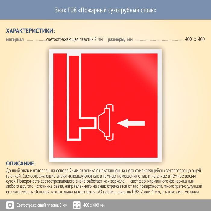 Знак F08 «Пожарный сухотрубный стояк» (светоотражающий пластик, 400х400 мм)