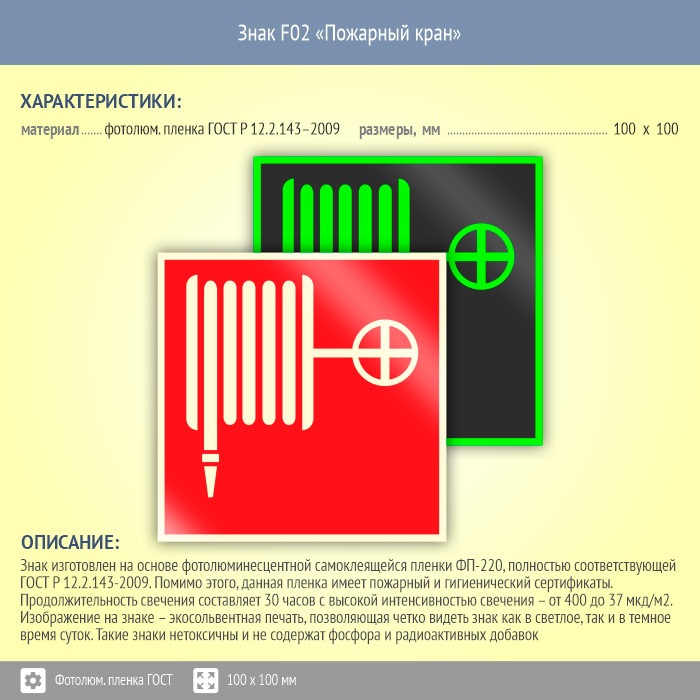 Знак F02 «Пожарный кран» на фотолюминесцентной пленке по ГОСТ 34428-2018, размером 100х100 мм обозначает место расположения пожарного крана. Знаки пожарной безопасности изготовлены согласно ГОСТ Р 12.4.026-2015 и предназначены для обозначения мест нахождения средств противопожарной защиты и средств оповещения о возникновении пожара