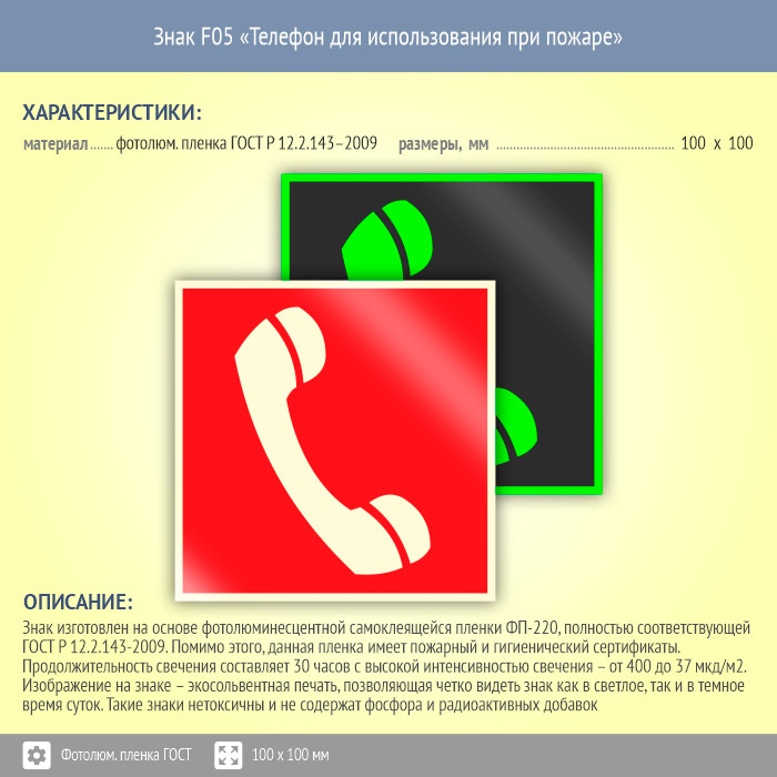 Знак F05 «Телефон для использования при пожаре (в том числе телефон прямой связи с пожарной охраной)» на фотолюминесцентной пленке по ГОСТ 34428-2018, размером 100х100 мм обозначает, что этот телефон можно использовать только в случае пожара. Знаки пожарной безопасности изготовлены согласно ГОСТ Р 12.4.026-2015 и предназначены для обозначения мест нахождения средств противопожарной защиты и средств оповещения о возникновении пожара