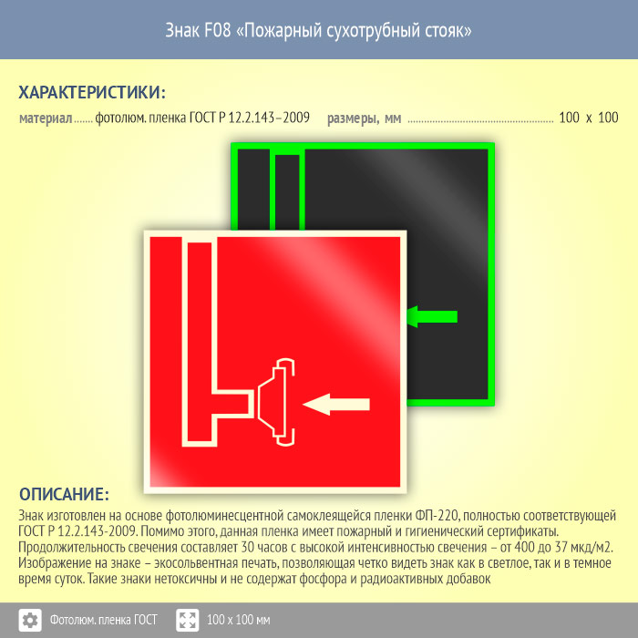 Знак F08 «Пожарный сухотрубный стояк» на фотолюминесцентной пленке по ГОСТ 34428-2018, размером 100х100 мм обозначает месторасположение пожарного стояка. Знаки пожарной безопасности изготовлены согласно ГОСТ Р 12.4.026-2015 и предназначены для обозначения мест нахождения средств противопожарной защиты и средств оповещения о возникновении пожара