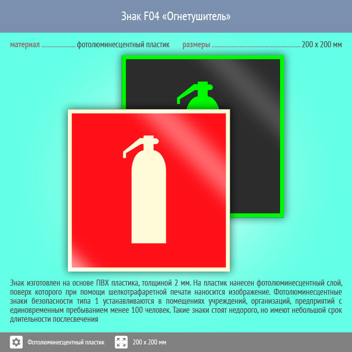Знак F04 «Огнетушитель» на фотолюминесцентном пластике, размером 200х200 мм обозначает место расположения одного или нескольких огнетушителей. Знаки пожарной безопасности изготовлены согласно ГОСТ Р 12.4.026-2015 и предназначены для обозначения мест нахождения средств противопожарной защиты и средств оповещения о возникновении пожара