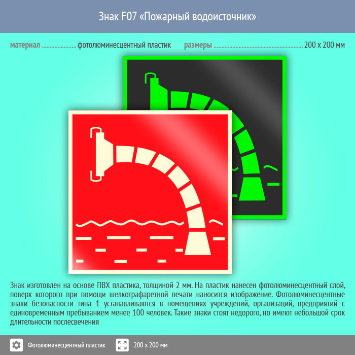Знак F07 «Пожарный водоисточник» на фотолюминесцентном пластике, размером 200х200 мм обозначает место расположения пожарного водоисточника. Знаки пожарной безопасности изготовлены согласно ГОСТ Р 12.4.026-2015 и предназначены для обозначения мест нахождения средств противопожарной защиты и средств оповещения о возникновении пожара