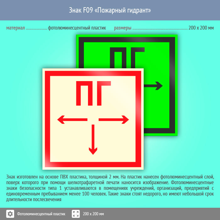 Знак F09 «Пожарный гидрант» (фотолюминесцентный пластик, 200х200 мм)