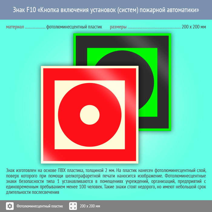 Знак F10 «Кнопка включения установок (систем) пожарной автоматики» на фотолюминесцентном пластике, размером 200х200 мм размещается над кнопкой включения пожарной сигнализации или включения противопожарной установки. Знаки пожарной безопасности изготовлены согласно ГОСТ Р 12.4.026-2015 и предназначены для обозначения мест нахождения средств противопожарной защиты и средств оповещения о возникновении пожара