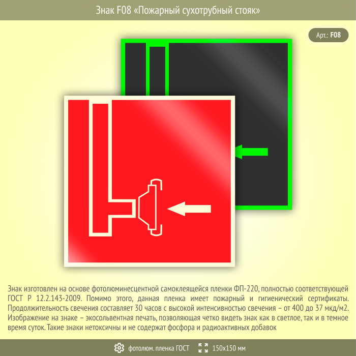 Знак F08 «Пожарный сухотрубный стояк» на фотолюминесцентной пленке по ГОСТ 34428-2018, размером 150х150 мм обозначает месторасположение пожарного стояка. Знаки пожарной безопасности изготовлены согласно ГОСТ Р 12.4.026-2015 и предназначены для обозначения мест нахождения средств противопожарной защиты и средств оповещения о возникновении пожара
