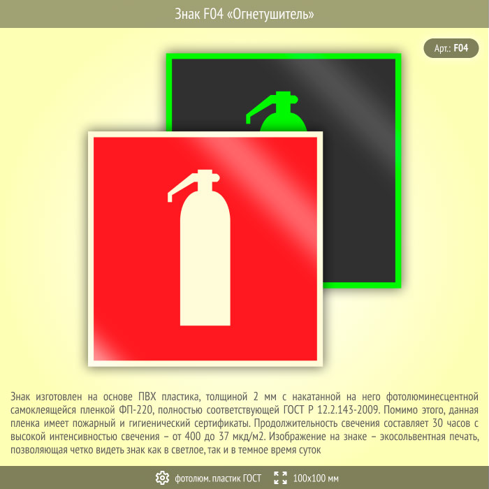 Знак F04 «Огнетушитель» на фотолюминесцентном пластике по ГОСТ 34428-2018, размером 100х100 мм обозначает место расположения одного или нескольких огнетушителей. Знаки пожарной безопасности изготовлены согласно ГОСТ Р 12.4.026-2015 и предназначены для обозначения мест нахождения средств противопожарной защиты и средств оповещения о возникновении пожара