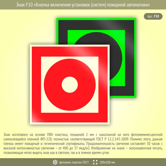 Знак F10 «Кнопка включения установок (систем) пожарной автоматики» на фотолюминесцентном пластике по ГОСТ 34428-2018, размером 100х100 мм размещается над кнопкой включения пожарной сигнализации или включения противопожарной установки. Знаки пожарной безопасности изготовлены согласно ГОСТ Р 12.4.026-2015 и предназначены для обозначения мест нахождения средств противопожарной защиты и средств оповещения о возникновении пожара