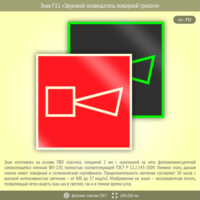 Знак F11 «Звуковой оповещатель пожарной тревоги» на фотолюминесцентном пластике по ГОСТ 34428-2018, размером 100х100 мм обозначает место расположения оповещателя в случае пожара. Знаки пожарной безопасности изготовлены согласно ГОСТ Р 12.4.026-2015 и предназначены для обозначения мест нахождения средств противопожарной защиты и средств оповещения о возникновении пожара