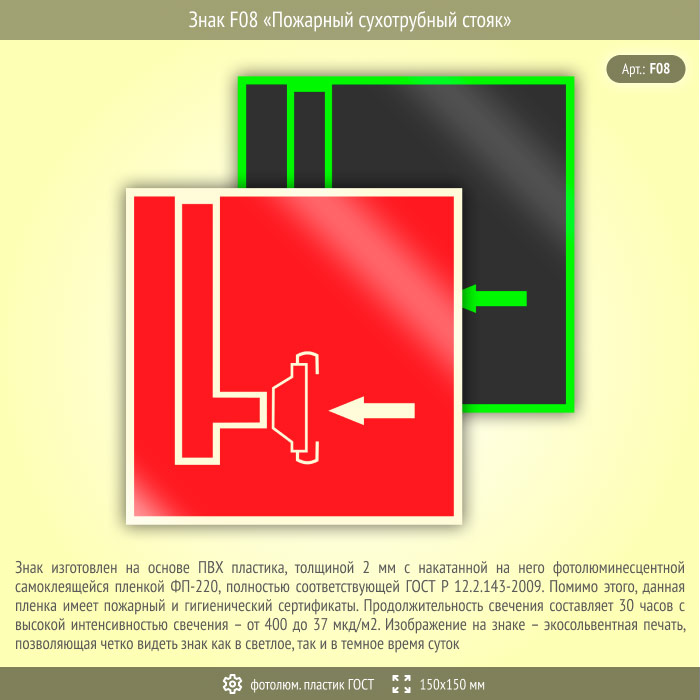 Знак F08 «Пожарный сухотрубный стояк» на фотолюминесцентном пластике по ГОСТ 34428-2018, размером 150х150 мм обозначает месторасположение пожарного стояка. Знаки пожарной безопасности изготовлены согласно ГОСТ Р 12.4.026-2015 и предназначены для обозначения мест нахождения средств противопожарной защиты и средств оповещения о возникновении пожара