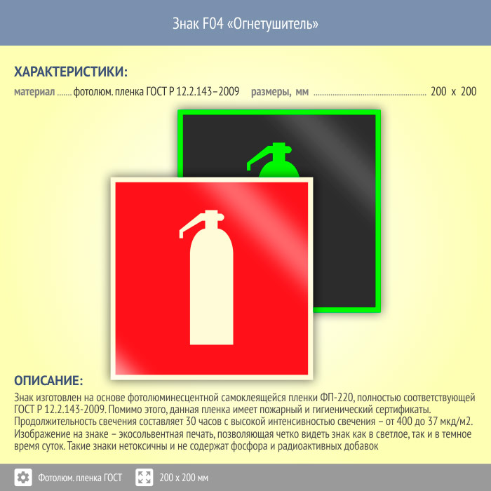 Знак F04 «Огнетушитель» на фотолюминесцентной пленке по ГОСТ 34428-2018, размером 200х200 мм обозначает место расположения одного или нескольких огнетушителей. Знаки пожарной безопасности изготовлены согласно ГОСТ Р 12.4.026-2015 и предназначены для обозначения мест нахождения средств противопожарной защиты и средств оповещения о возникновении пожара