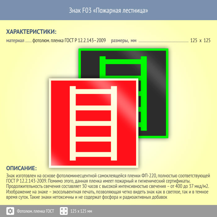 Знак F03 «Пожарная лестница» на фотолюминесцентной пленке по ГОСТ 34428-2018, размером 125х125 мм указывает, что здесь расположена лестница для использования при пожаре. Знаки пожарной безопасности изготовлены согласно ГОСТ Р 12.4.026-2015 и предназначены для обозначения мест нахождения средств противопожарной защиты и средств оповещения о возникновении пожара