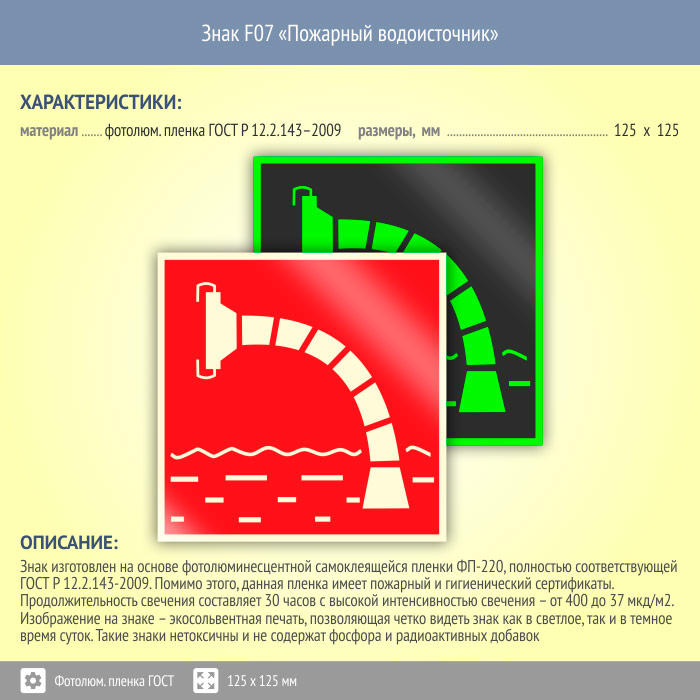 Знак F07 «Пожарный водоисточник» на фотолюминесцентной пленке по ГОСТ 34428-2018, размером 125х125 мм обозначает место расположения пожарного водоисточника. Знаки пожарной безопасности изготовлены согласно ГОСТ Р 12.4.026-2015 и предназначены для обозначения мест нахождения средств противопожарной защиты и средств оповещения о возникновении пожара