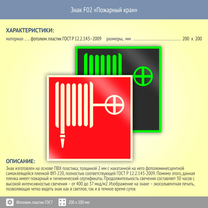 Знак F02 «Пожарный кран» на фотолюминесцентном пластике по ГОСТ 34428-2018, размером 200х200 мм обозначает место расположения пожарного крана. Знаки пожарной безопасности изготовлены согласно ГОСТ Р 12.4.026-2015 и предназначены для обозначения мест нахождения средств противопожарной защиты и средств оповещения о возникновении пожара