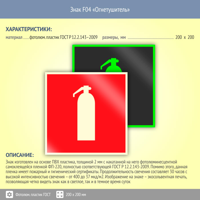 Знак F04 «Огнетушитель» (фотолюминесцентный пластик ГОСТ 34428-2018, 200х200 мм)