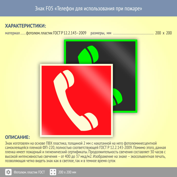 Знак F05 «Телефон для использования при пожаре (в том числе телефон прямой связи с пожарной охраной)» на фотолюминесцентном пластике по ГОСТ 34428-2018, размером 200х200 мм обозначает, что этот телефон можно использовать только в случае пожара. Знаки пожарной безопасности изготовлены согласно ГОСТ Р 12.4.026-2015 и предназначены для обозначения мест нахождения средств противопожарной защиты и средств оповещения о возникновении пожара