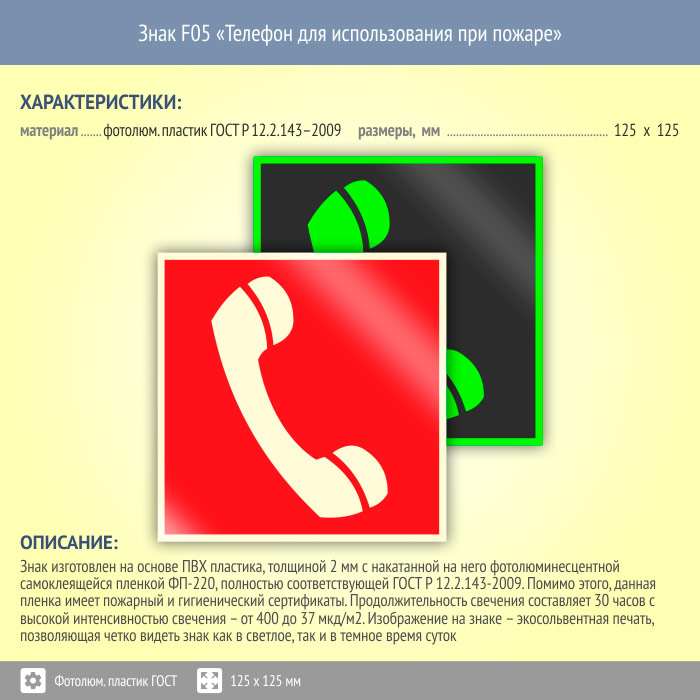 Знак F05 «Телефон для использования при пожаре (в том числе телефон прямой связи с пожарной охраной)» на фотолюминесцентном пластике по ГОСТ 34428-2018, размером 125х125 мм обозначает, что этот телефон можно использовать только в случае пожара. Знаки пожарной безопасности изготовлены согласно ГОСТ Р 12.4.026-2015 и предназначены для обозначения мест нахождения средств противопожарной защиты и средств оповещения о возникновении пожара