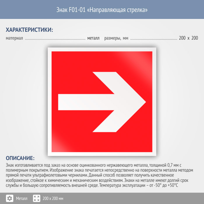 Знак F01-01 «Направляющая стрелка» на металле, размером 200х200 мм указывает направление пути эвакуации налево или направо. Знаки пожарной безопасности изготовлены согласно ГОСТ Р 12.4.026-2015 и предназначены для обозначения мест нахождения средств противопожарной защиты и средств оповещения о возникновении пожара