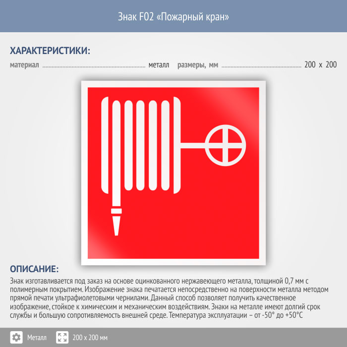 Знак F02 «Пожарный кран» на металле, размером 200х200 мм обозначает место расположения пожарного крана. Знаки пожарной безопасности изготовлены согласно ГОСТ Р 12.4.026-2015 и предназначены для обозначения мест нахождения средств противопожарной защиты и средств оповещения о возникновении пожара