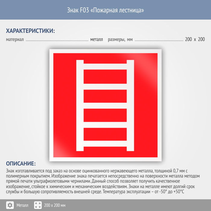 Знак F03 «Пожарная лестница» на металле, размером 200х200 мм указывает, что здесь расположена лестница для использования при пожаре. Знаки пожарной безопасности изготовлены согласно ГОСТ Р 12.4.026-2015 и предназначены для обозначения мест нахождения средств противопожарной защиты и средств оповещения о возникновении пожара