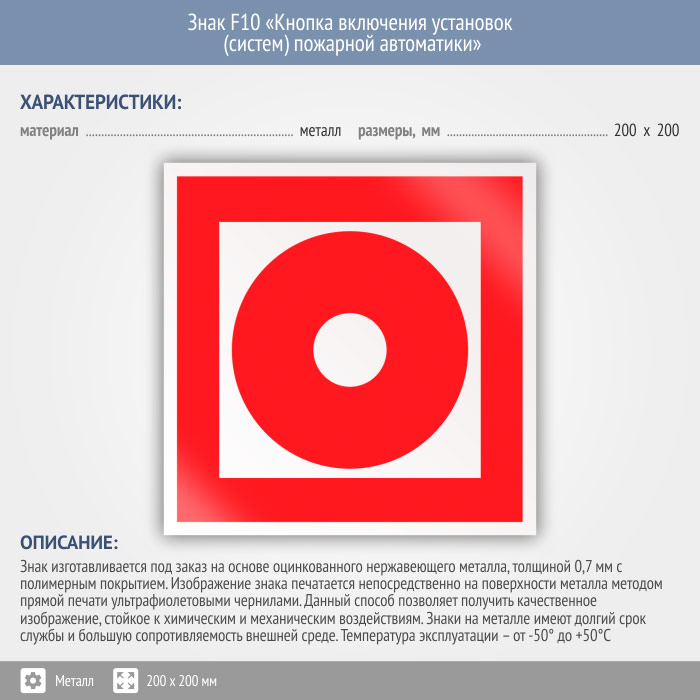 Знак F10 «Кнопка включения установок (систем) пожарной автоматики» на металле, размером 200х200 мм размещается над кнопкой включения пожарной сигнализации или включения противопожарной установки. Знаки пожарной безопасности изготовлены согласно ГОСТ Р 12.4.026-2015 и предназначены для обозначения мест нахождения средств противопожарной защиты и средств оповещения о возникновении пожара