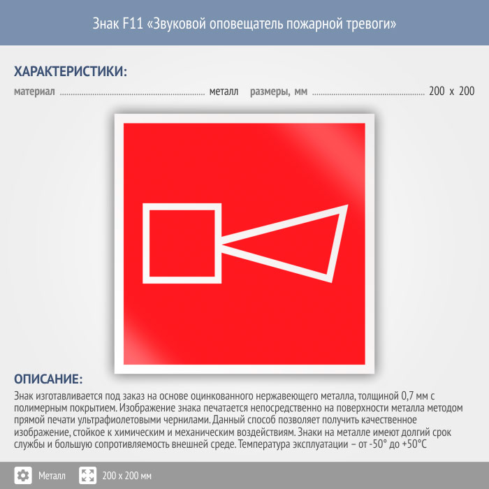Знак F11 «Звуковой оповещатель пожарной тревоги» на металле, размером 200х200 мм обозначает место расположения оповещателя в случае пожара. Знаки пожарной безопасности изготовлены согласно ГОСТ Р 12.4.026-2015 и предназначены для обозначения мест нахождения средств противопожарной защиты и средств оповещения о возникновении пожара