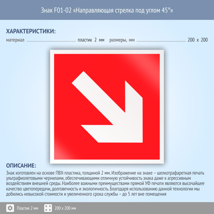 Знак F01-02 «Направляющая стрелка под углом 45°» на пластике, размером 200х200 мм указывает направление пути эвакуации вверх или вниз. Знаки пожарной безопасности изготовлены согласно ГОСТ Р 12.4.026-2015 и предназначены для обозначения мест нахождения средств противопожарной защиты и средств оповещения о возникновении пожара