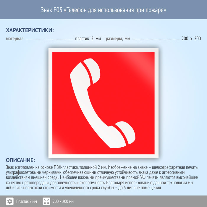 Знак F05 «Телефон для использования при пожаре (в том числе телефон прямой связи с пожарной охраной)» на пластике, размером 200х200 мм обозначает, что этот телефон можно использовать только в случае пожара. Знаки пожарной безопасности изготовлены согласно ГОСТ Р 12.4.026-2015 и предназначены для обозначения мест нахождения средств противопожарной защиты и средств оповещения о возникновении пожара