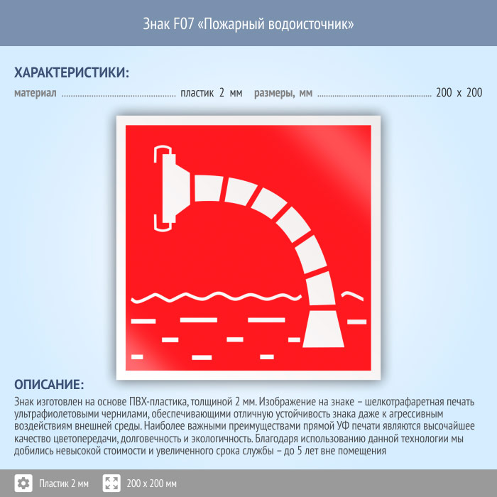 Знак F07 «Пожарный водоисточник» на пластике, размером 200х200 мм обозначает место расположения пожарного водоисточника. Знаки пожарной безопасности изготовлены согласно ГОСТ Р 12.4.026-2015 и предназначены для обозначения мест нахождения средств противопожарной защиты и средств оповещения о возникновении пожара