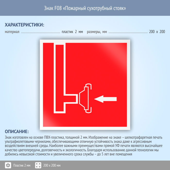 Знак F08 «Пожарный сухотрубный стояк» (пластик, 200х200 мм)