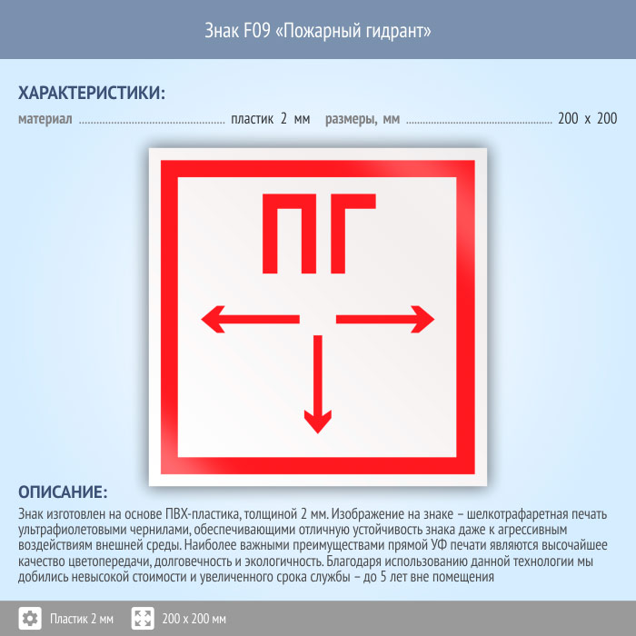 Знак F09 «Пожарный гидрант» на пластике, размером 200х200 мм указывает пожарному расчету расстояние до ближайшего подземного гидранта, тем самым позволяя сократить время подготовки к тушению, в целях минимизации потерь и скорейшего устранения возгорания. Знаки пожарной безопасности изготовлены согласно ГОСТ Р 12.4.026-2015 и предназначены для обозначения мест нахождения средств противопожарной защиты и средств оповещения о возникновении пожара