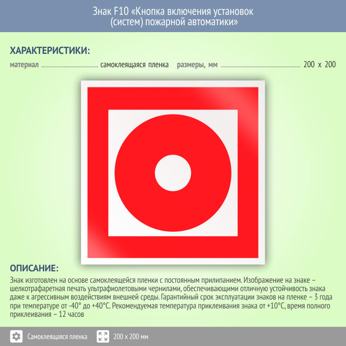 Знак F10 «Кнопка включения установок (систем) пожарной автоматики» на пленке, размером 200х200 мм размещается над кнопкой включения пожарной сигнализации или включения противопожарной установки. Знаки пожарной безопасности изготовлены согласно ГОСТ Р 12.4.026-2015 и предназначены для обозначения мест нахождения средств противопожарной защиты и средств оповещения о возникновении пожара