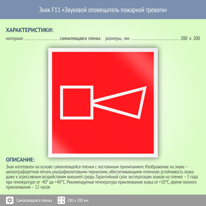 Знак F11 «Звуковой оповещатель пожарной тревоги» на пленке, размером 200х200 мм обозначает место расположения оповещателя в случае пожара. Знаки пожарной безопасности изготовлены согласно ГОСТ Р 12.4.026-2015 и предназначены для обозначения мест нахождения средств противопожарной защиты и средств оповещения о возникновении пожара